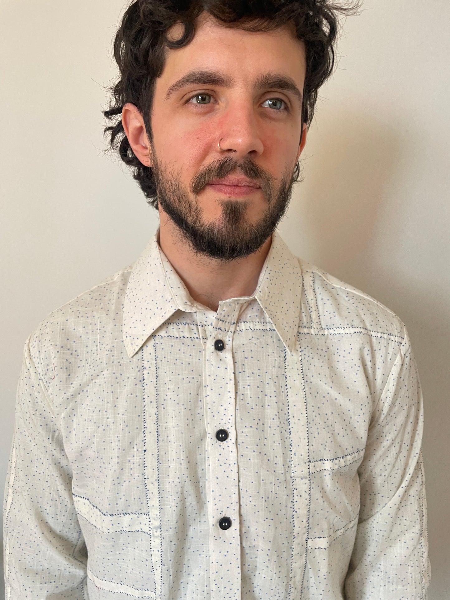 This is a zero-waste shirt that uses only reclaimed fabrics from a handloom factory in India. Some of the offcuts have screen-printed gold spots.